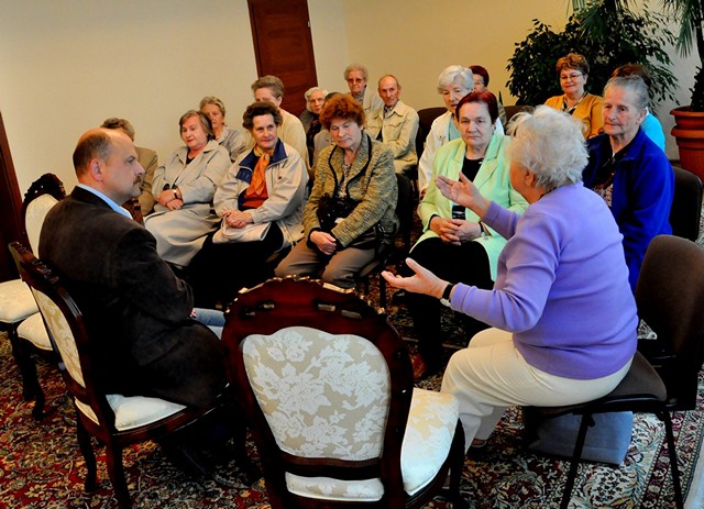 Spotkanie z burmistrzem Więcborka Pawłem Toczko odbyło się w dostojnej scenerii, bowiem miało miejsce w Sali Ślubów Urzędu Stanu Cywilnego w Więcborku. Seniorzy pytali burmistrza o sprawy życia codziennego, które ich nurtują jako mieszkańców miasta. Jednak głównymi tematami spotkania były aspekty historyczne Więcborka i jego społeczeństwa. Klubowicze wspominali nasze miasto z czasów okupacji hitlerowskiej, a także PRL-u. Jak się okazało, wiedza historyczna pana burmistrza jest ogromna. Dyskusja była momentami niesamowicie interesująca. Była to – z pewnością – znakomita lekcja historii Więcborka, opowiedziana przez naocznych jej świadków.
