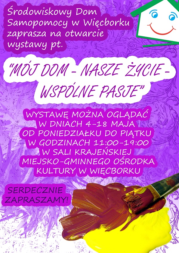 “Mój Dom – Nasze Życie – Wspólne Pasje” – to tytuł wystawy prac uczestników Środowiskowego Domu Samopomocy w Więcborku oraz Klubu Samopomocy Domek w Więcborku. Wystawę można oglądać w Sali Krajeńskiej Miejsko-Gminnego Ośrodka Kultury w Więcborku, od poniedziałku do piątku w godzinach 11:00-19:00 od 4 do 18 maja. Serdecznie zapraszamy!