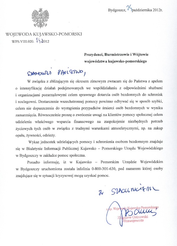 Zamieszczamy pismo Wicewojewody Województwa Kujawsko – Pomorskiego, pana Zbigniewa Ostrowskiego, w sprawie pomocy osobom bezdomnym w okresie zimowym. Ponadto informujemy, iż uruchomiono specjalną infolinię 0-800-301-630, pod numerem której osoby znajdujące się w sytuacji kryzysowej mogą uzyskać pomoc.