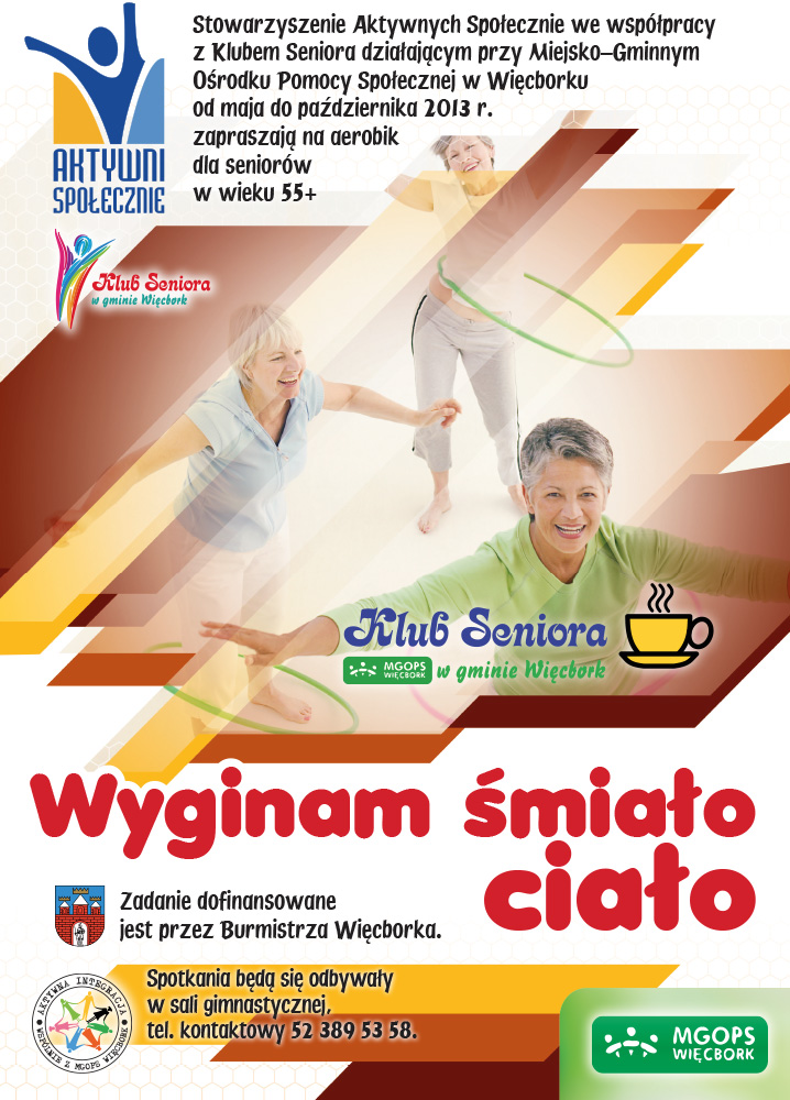 Stowarzyszenie Aktywnych Społecznie w Więcborku, we współpracy z Klubem Seniora działającym przy Miejsko-Gminnym Ośrodku Pomocy Społecznej w Więcborku od maja do października 2013 roku zapraszają na aerobik dla Seniorów w wieku 55+. Więcej informacji można uzyskać pod numerem telefonu: 52 389 53 58.