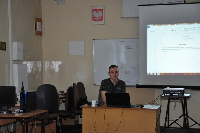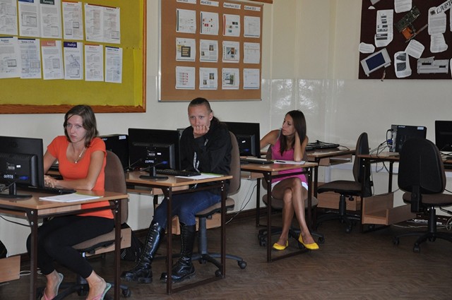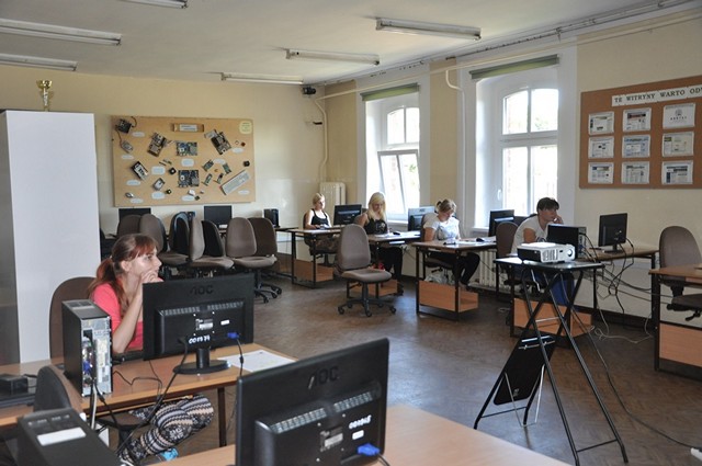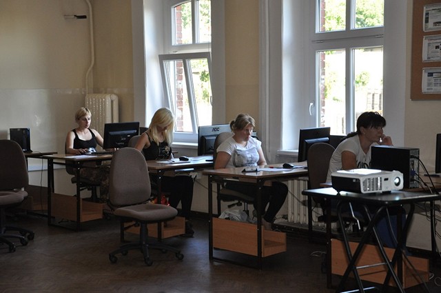 Uczestnicy projektu systemowego pn. “interAKTYWNI”, współfinansowanego przez Unię Europejską w ramach Europejskiego Funduszu Społecznego, biorą udział w warsztatach komputerowych, które obywają się w sali informatycznej Centrum Kształcenia Zawodowego i Ustawicznego w Więcborku.