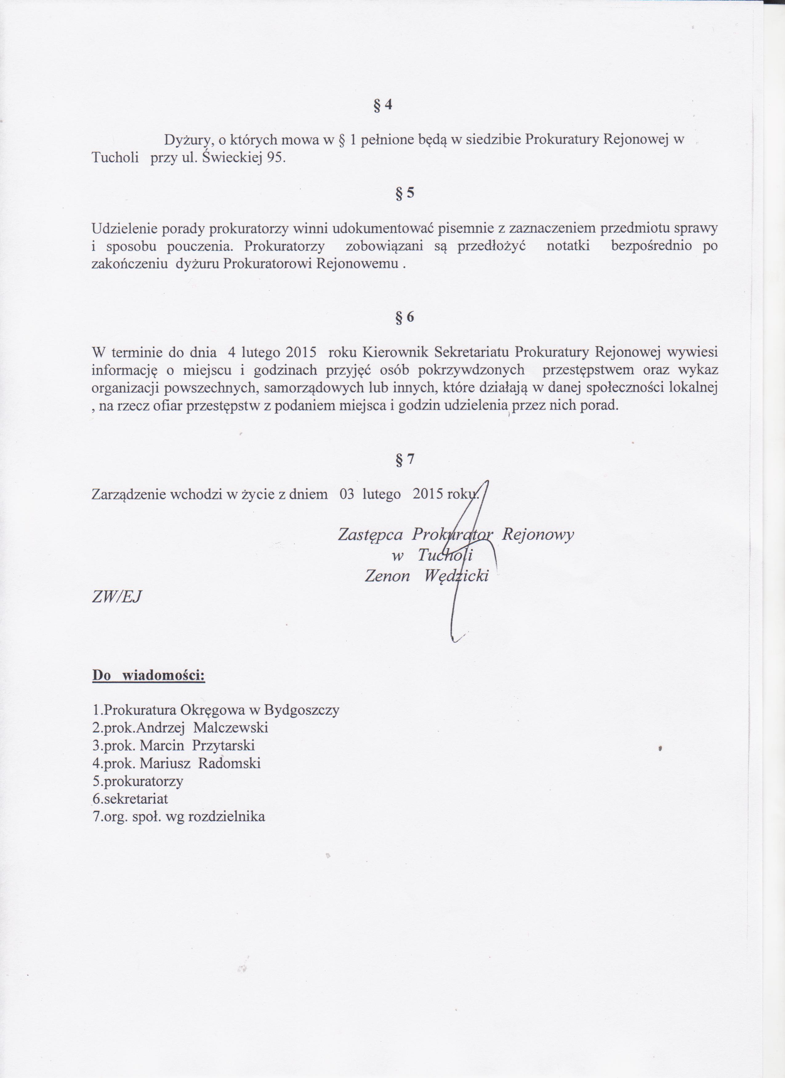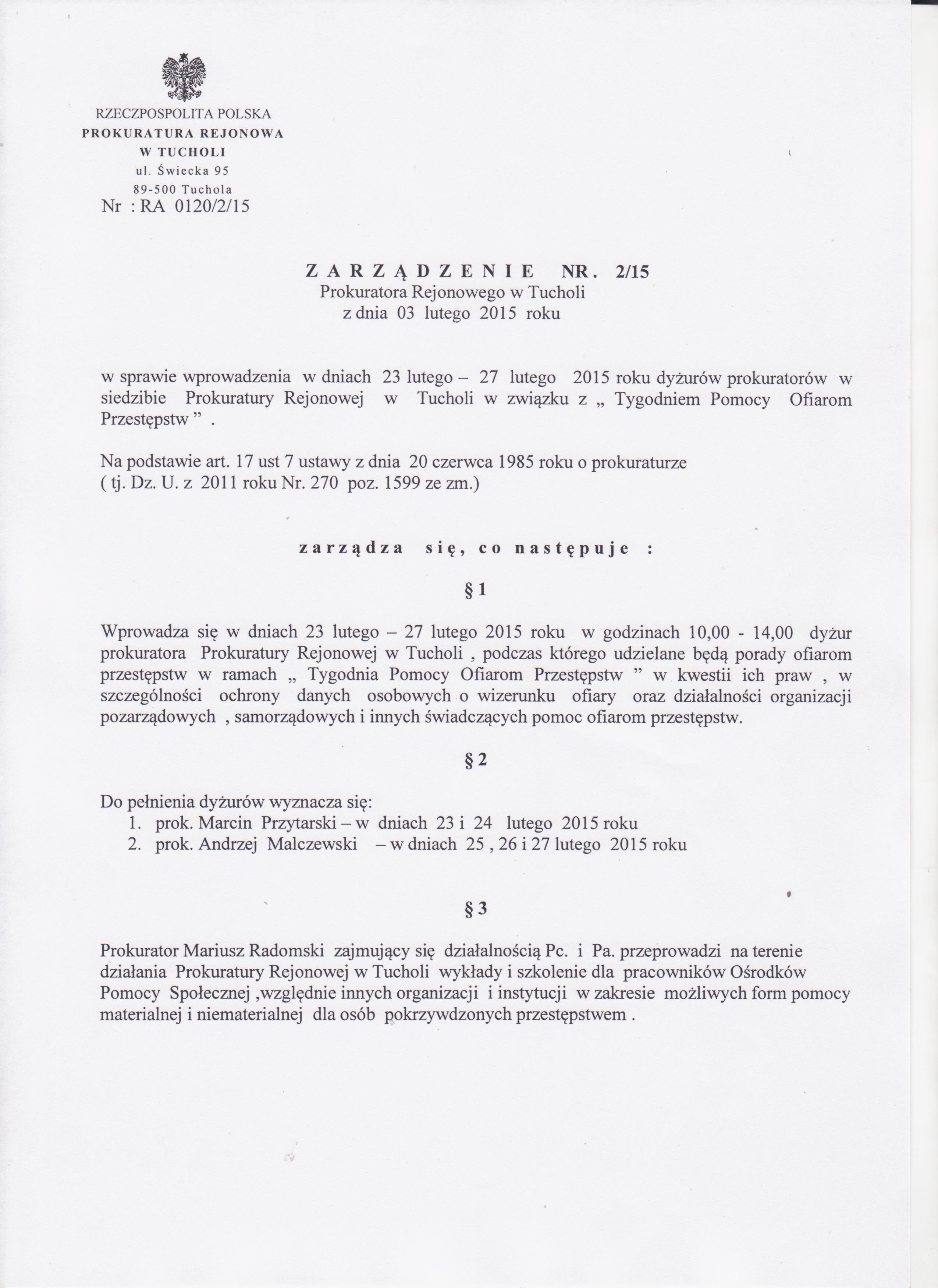 Poniżej publikujemy zarządzenie prokuratora Rejonowego w Tucholi z dnia 3 lutego 2015 roku w sprawie wprowadzenia w dniach 23 lutego – 27 lutego 2015 roku dyżurów prokuratorów w siedzibie Prokuratury Rejonowej w Tucholi w związku z “Tygodniem Pomocy Ofiarom Przestępstw”.