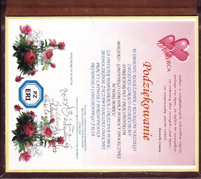 Podczas jubileuszowego XX Wieczoru Seniora, Miejsko-Gminny Ośrodek Pomocy Społecznej w Więcborku otrzymał podziękowanie od Polskiego Związku Emerytów Rencistów i Inwalidów – Oddziału Rejonowego w Więcborku za owocną współpracę i okazaną pomoc. W imieniu seniorów, dyrekcji MGOPS podziękowanie wręczyła posłanka na Sejm RP Iwona Kozłowska.