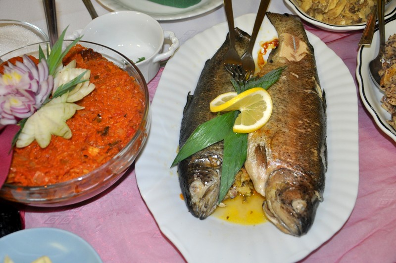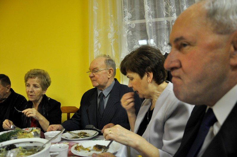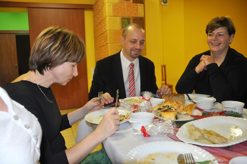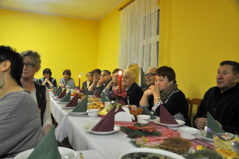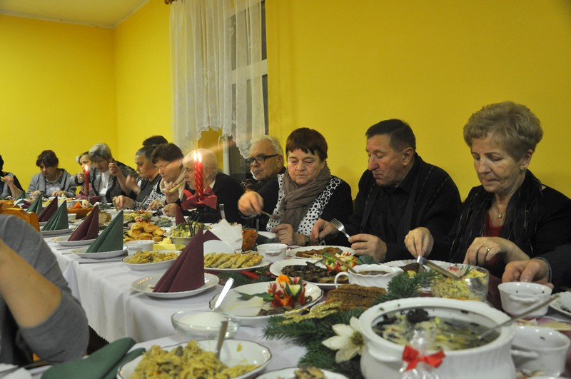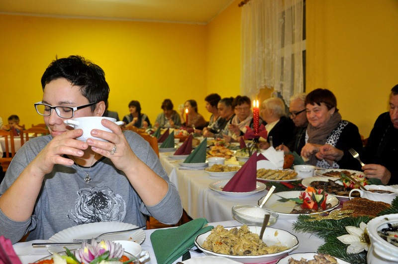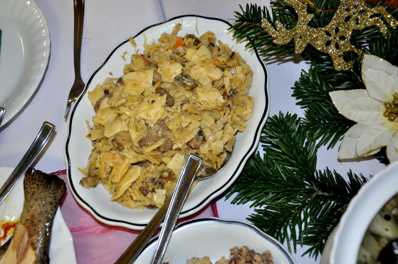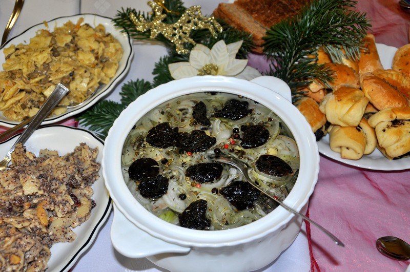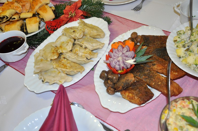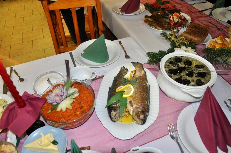Na białych obrusach, przy świątecznym wystroju pojawiły się, m.in: łazanki z kapustą i grzybami, paszteciki z grzybami, pstrąg faszerowany, barszcz czerwony, karp smażony, pierogi z kapustą i grzybami, sałatka z śledziem, śledź z śliwką, sałatka warzywna.