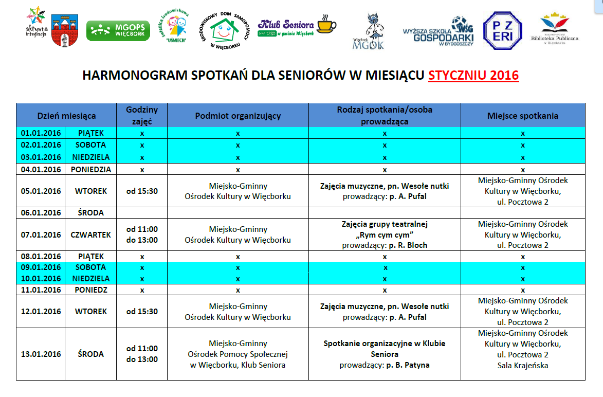Lokalne jednostki organizacyjne przygotowały dla seniorów z terenu miasta i gminy Więcbork ofertę wsparcia w postaci spotkań o charakterze kulturalnym, edukacyjnym oraz rozrywkowym. Ze wszystkich inicjatyw został stworzony harmonogram spotkań, który zamieszczamy na naszej stronie internetowej (lewa kolumna pozycja „Harmonogram spotkań seniorów”). Można go również pobrać klikając tutaj.