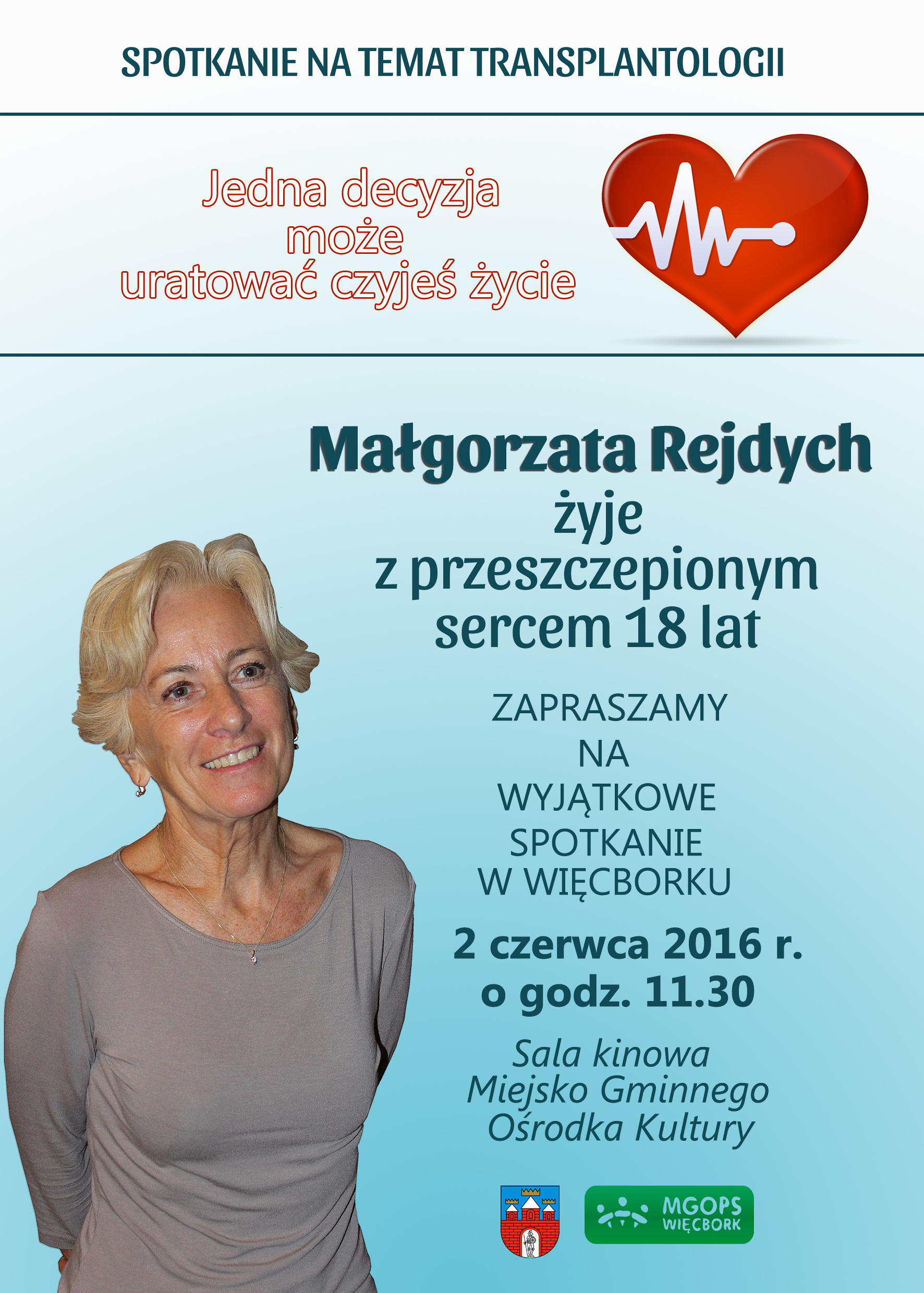 Małgorzata Rejdych to jedna z najdłużej żyjących kobiet po przeszczepie serca w Polsce. Na spotkaniu w Więcborku, będzie mówiła jak wygląda życie przed przeszczepem i jak radzić sobie z akceptacją nowego organu. Jej spotkania szczególnie z młodzieżą wnoszą wiele informacji na temat: procedur związanych z oddaniem organów a także zgodą rodziny na takie czynności. Jest to bardzo ciekawa lekcja na przyszłość. I co najważniejsze, kontakt z osobą, która po przeszczepie serca jest zdrowa i żyje normalnie. Małgorzata Rejdych to także osoba, która angażuje się w pomoc ludziom oczekującym na transplantację. Na spotkaniu w Więcborku, będzie można dowiedzieć się także jak jest wartość życia człowieka i co powinniśmy cenić każdego dnia!