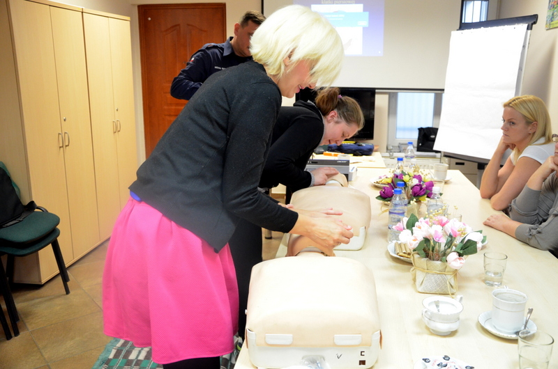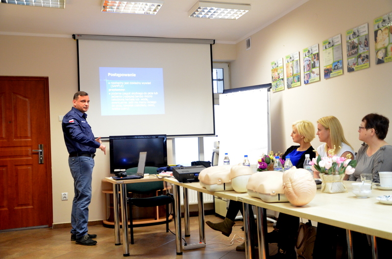 Szkolenie odbyło się na początku listopada, poprowadził je ratownik medyczny, pan Michał Skowron. Program zajęć zakładał omówienie (i przećwiczenie) m.in. takich zagadnień jak: bezpieczeństwo na miejscu zdarzenia, prawidłowe zabezpieczenie miejsca zdarzenia, ocena stanu świadomości, resuscytacja krążeniowo – oddechowa, pozycja bezpieczna.
