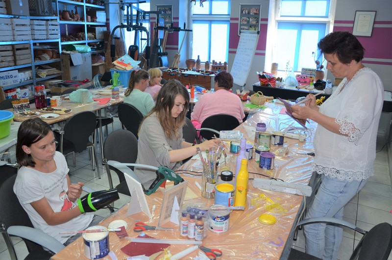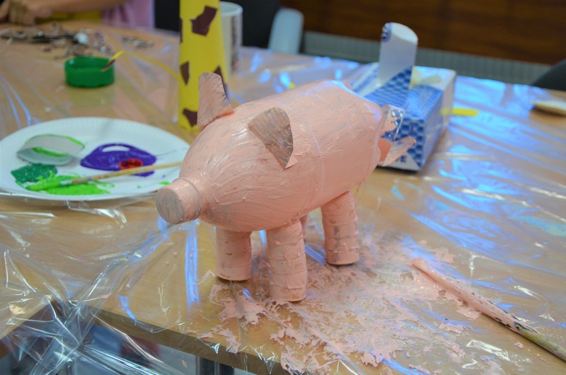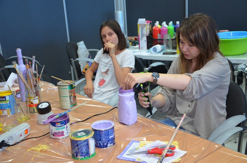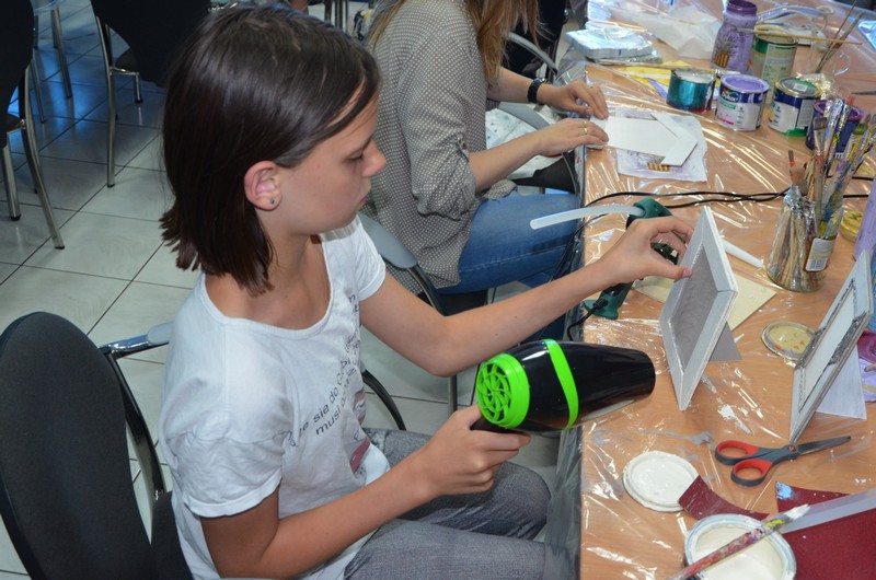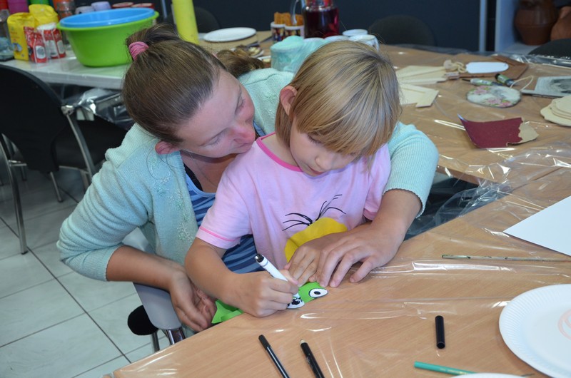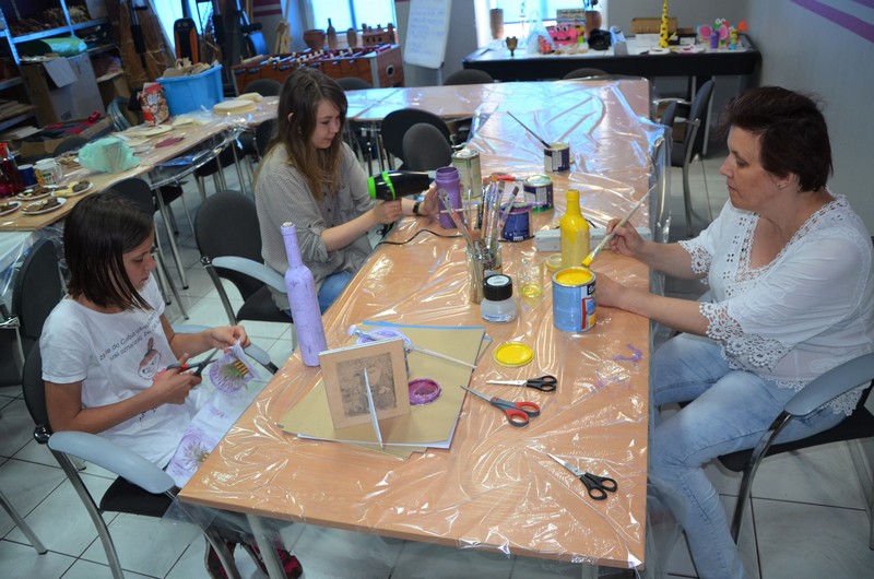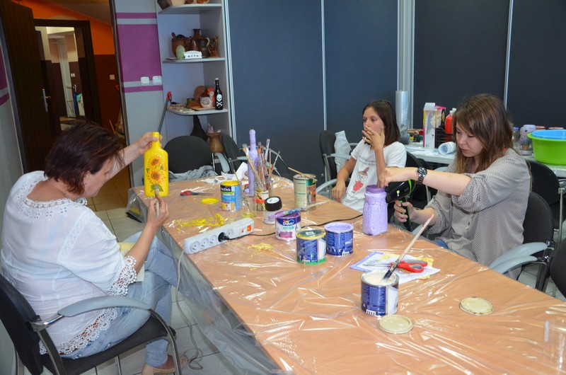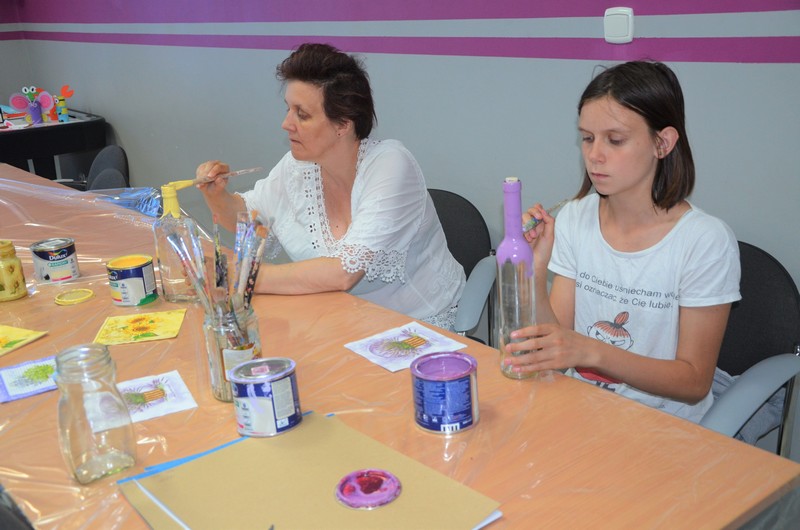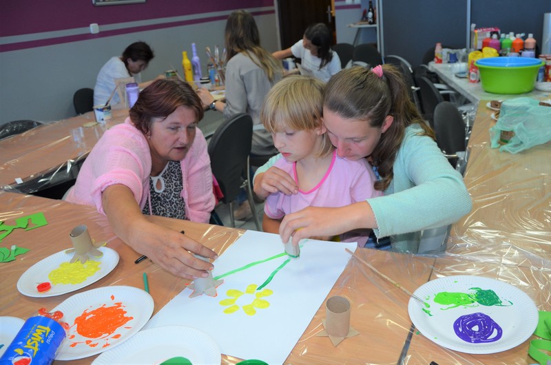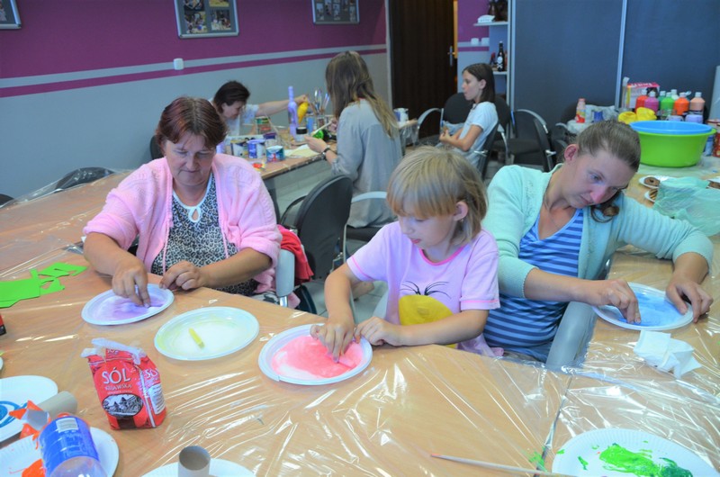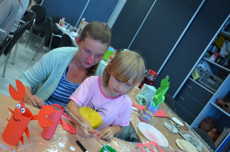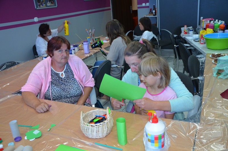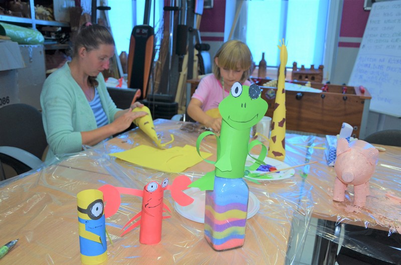 Rodzice wspólnie ze swoimi pociechami wykonali: decoupage, piękne malunki przy wykorzystaniu rolek od papieru toaletowego, nakrętek, zwierzęta z plastikowych butelek, ramki do zdjęć. Dużo radości sprawiło wypełnianie butelek szklanych i słoiczków solą w połączeniu z kolorową kredą.