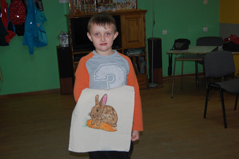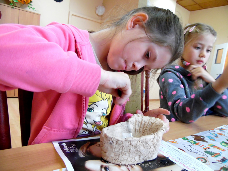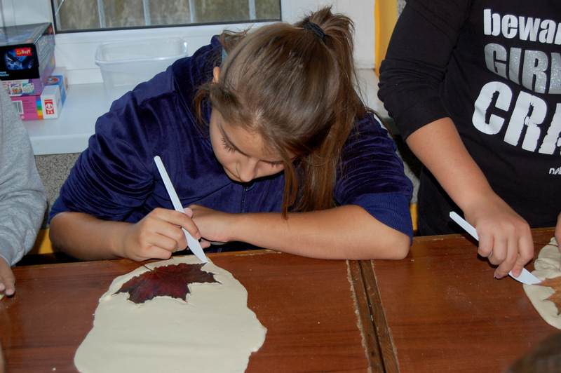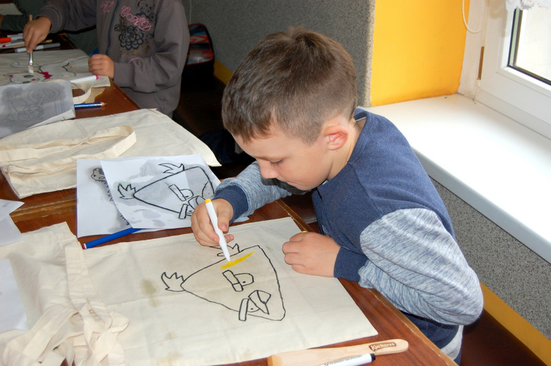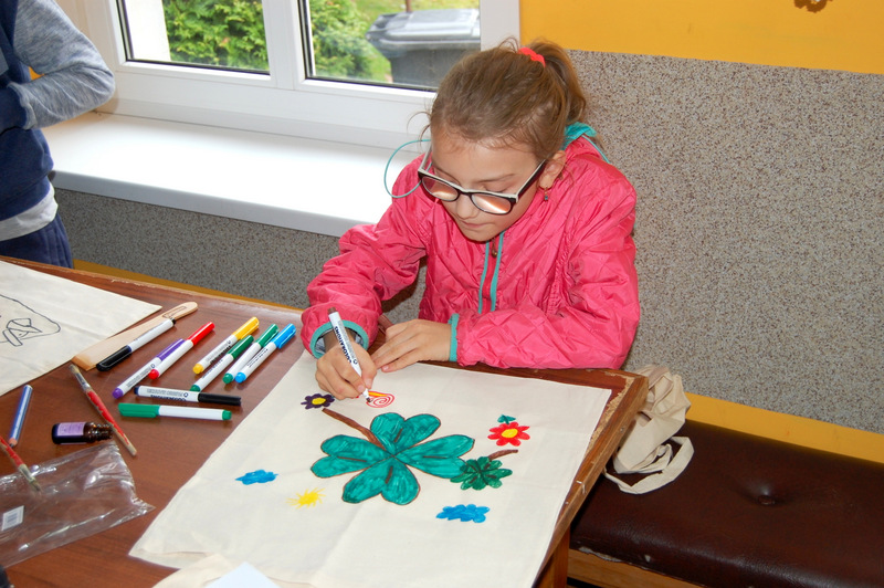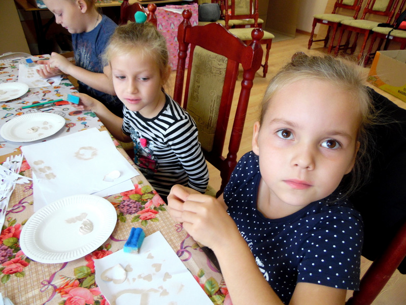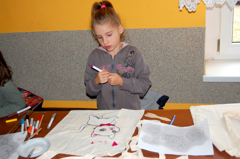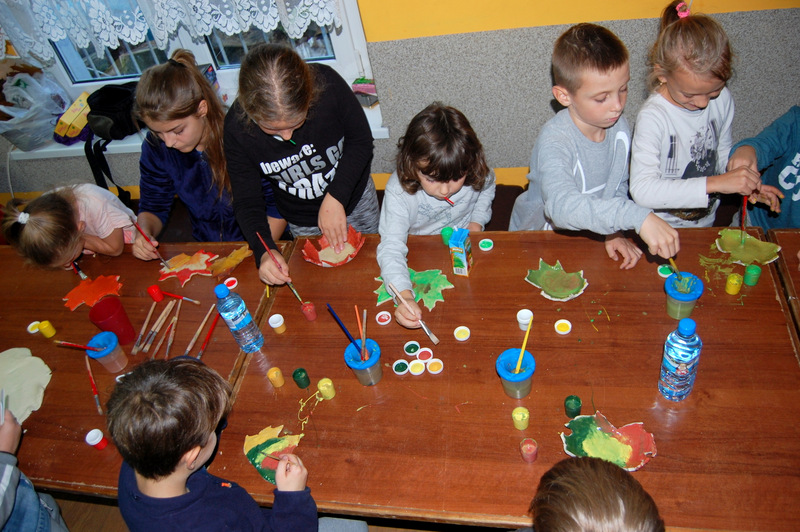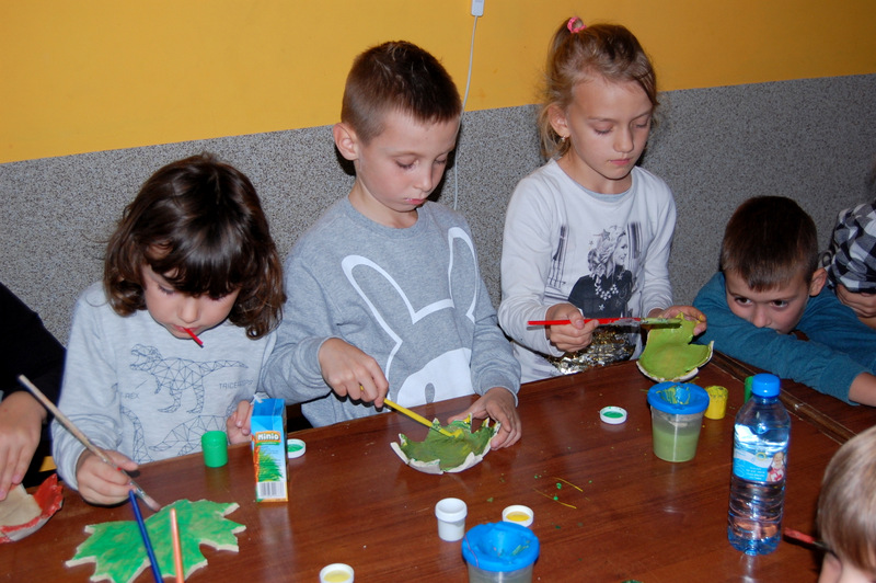 Pierwsze spotkanie w październiku było kontynuacją tematu jesiennego rozpoczętego na ostatnich zajęciach września. Dzieci wykonały liście i liściowe miseczki z masy solnej, które pomalowały na jesienne kolory. Na drugim spotkaniu dzieci zajęły się trudną sztuką filcowania na mokro tworząc piękne, kolorowe kwiaty. Podczas kolejnego spotkania stworzone zostały kolorowe, ręcznie malowane eko-torby zainspirowane motywami bajkowymi i zwierzęcymi. Na ostatnich zajęciach dzieci wykonały ozdobną ramkę do oprawienia swojej fotografii. Dzieci malowały tekturowe ramki oraz przyklejały do nich ozdoby z filcu, kolorowe kryształy, pocięte płyty CD.