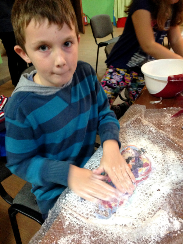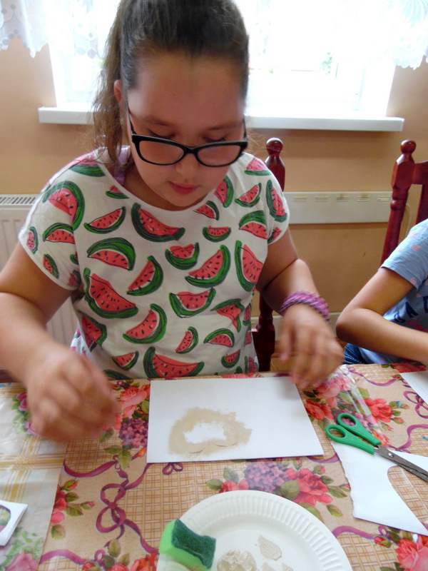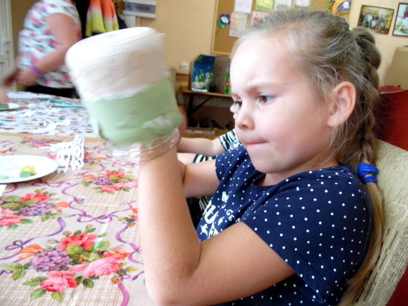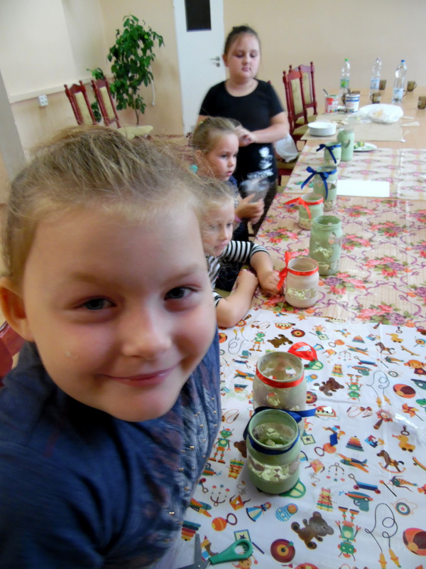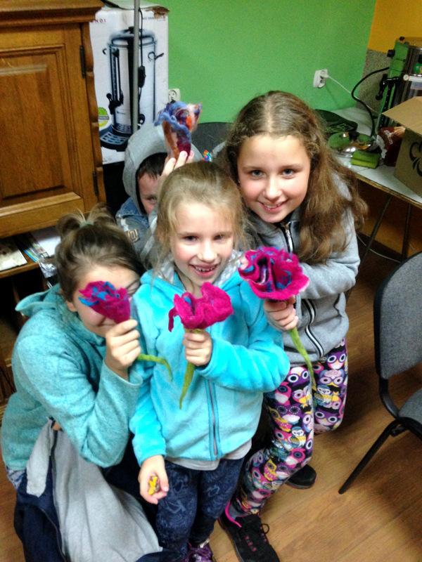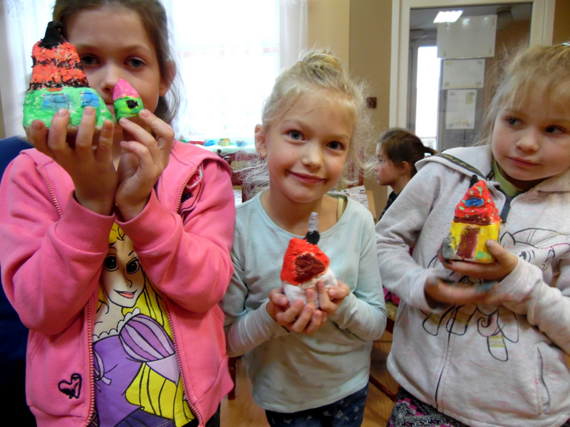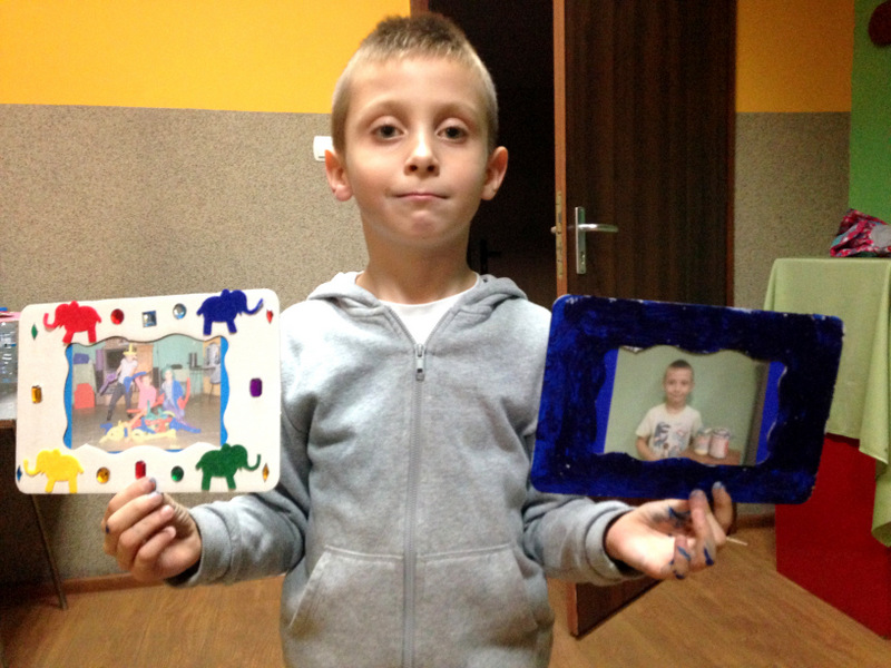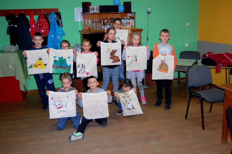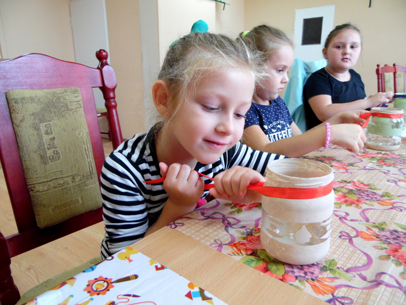 Pierwsze spotkanie w październiku było kontynuacją tematu jesiennego rozpoczętego na ostatnich zajęciach września. Dzieci wykonały liście i liściowe miseczki z masy solnej, które pomalowały na jesienne kolory. Na drugim spotkaniu dzieci zajęły się trudną sztuką filcowania na mokro tworząc piękne, kolorowe kwiaty. Podczas kolejnego spotkania stworzone zostały kolorowe, ręcznie malowane eko-torby zainspirowane motywami bajkowymi i zwierzęcymi. Na ostatnich zajęciach dzieci wykonały ozdobną ramkę do oprawienia swojej fotografii. Dzieci malowały tekturowe ramki oraz przyklejały do nich ozdoby z filcu, kolorowe kryształy, pocięte płyty CD.