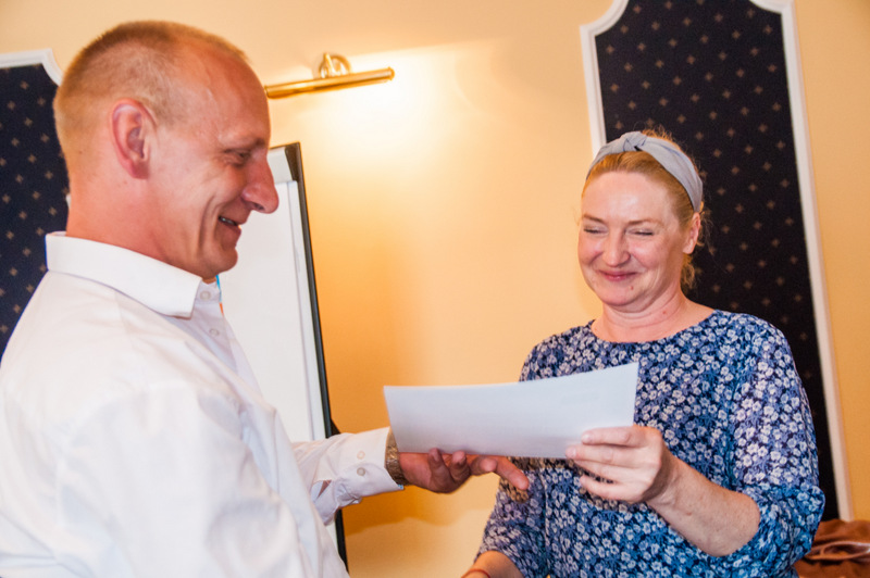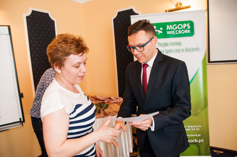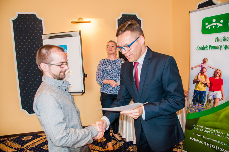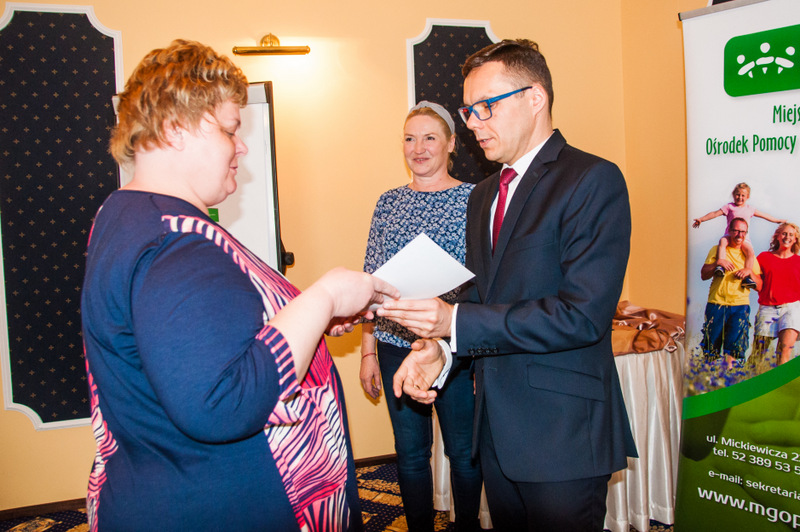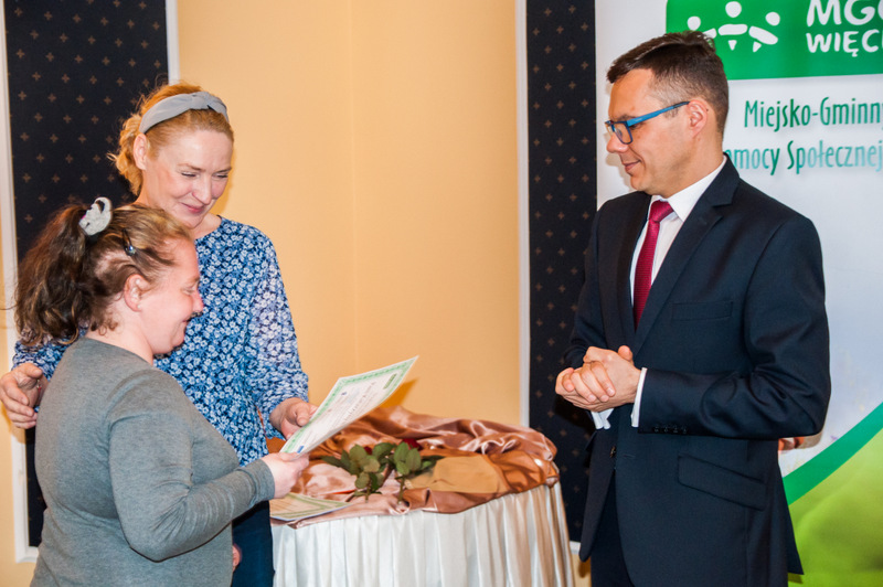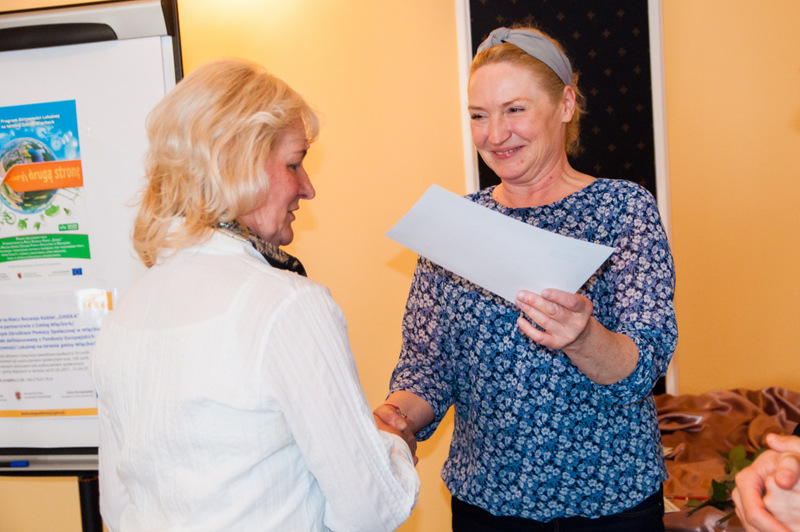 Spotkanie było okazją do podsumowania działań, bowiem realizacja projektu właśnie dobiega końca. Uczyniła to Izabela Szmaglinska, zastępca dyrektora MGOPS. Natomiast prezeska Stowarzyszenia na Rzecz Rozwoju Kobiet “GINEKA” (lider projektu), Iwona Borkowska oraz dyrektor MGOPS (partner projektu), Tomasz Siekierka podziękowali uczestnikom za udział w przedsięwzięciu i pogratulowali zdobycia nowych kompetencji. Specjalne gratulacje skierowali do ośmiorga uczestników, którzy uzyskali zatrudnienie. Słowa podziękowań trafiły też do pracowników stowarzyszenia i ośrodka, którzy realizowali zadania projektowe. Każdy z uczestników otrzymał certyfikat. W rewanżu, uczestnicy projektu wręczyli bukiety kwiatów realizatorom, dziękując za ich pracę.