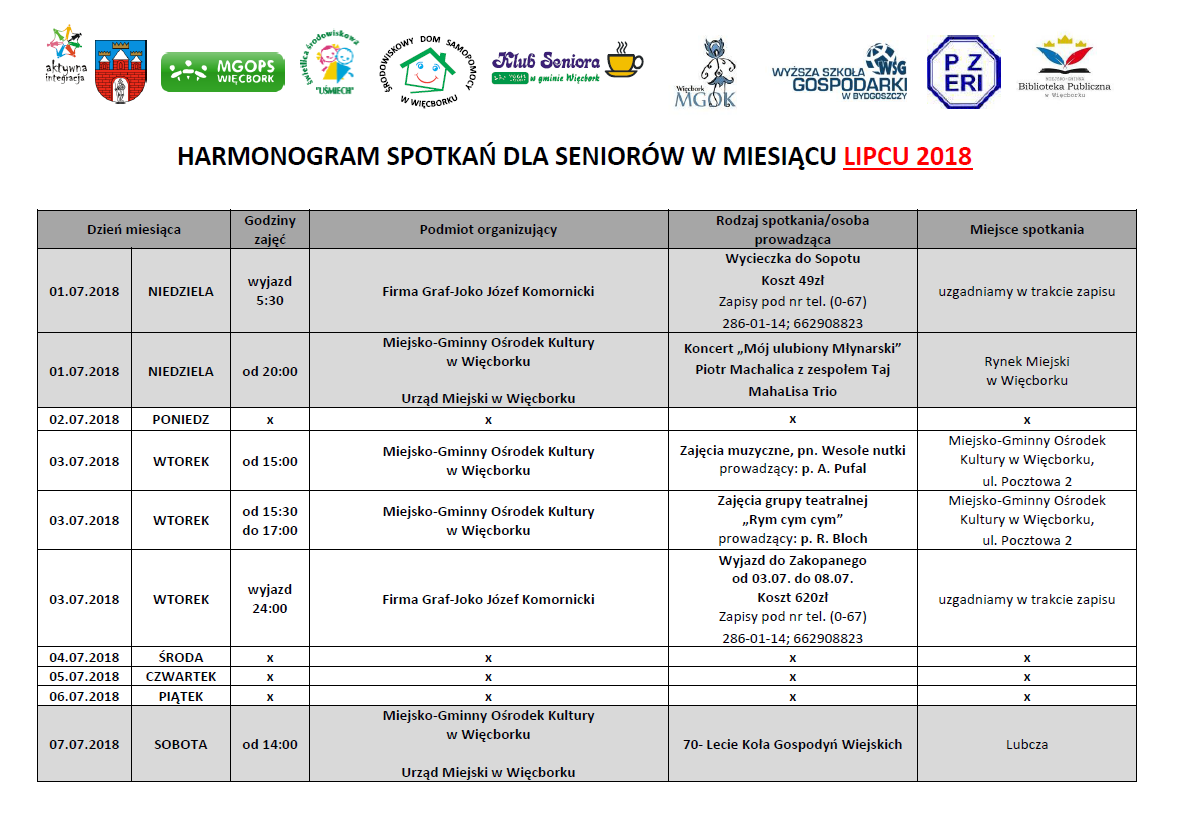Lokalne jednostki organizacyjne przygotowały dla seniorów z terenu miasta i gminy Więcbork ofertę wsparcia w postaci spotkań o charakterze kulturalnym, edukacyjnym oraz rozrywkowym. Ze wszystkich inicjatyw został stworzony harmonogram spotkań, który zamieszczamy na naszej stronie internetowej (prawa kolumna, pozycja „Harmonogram spotkań seniorów”). Można go również pobrać klikając tutaj.