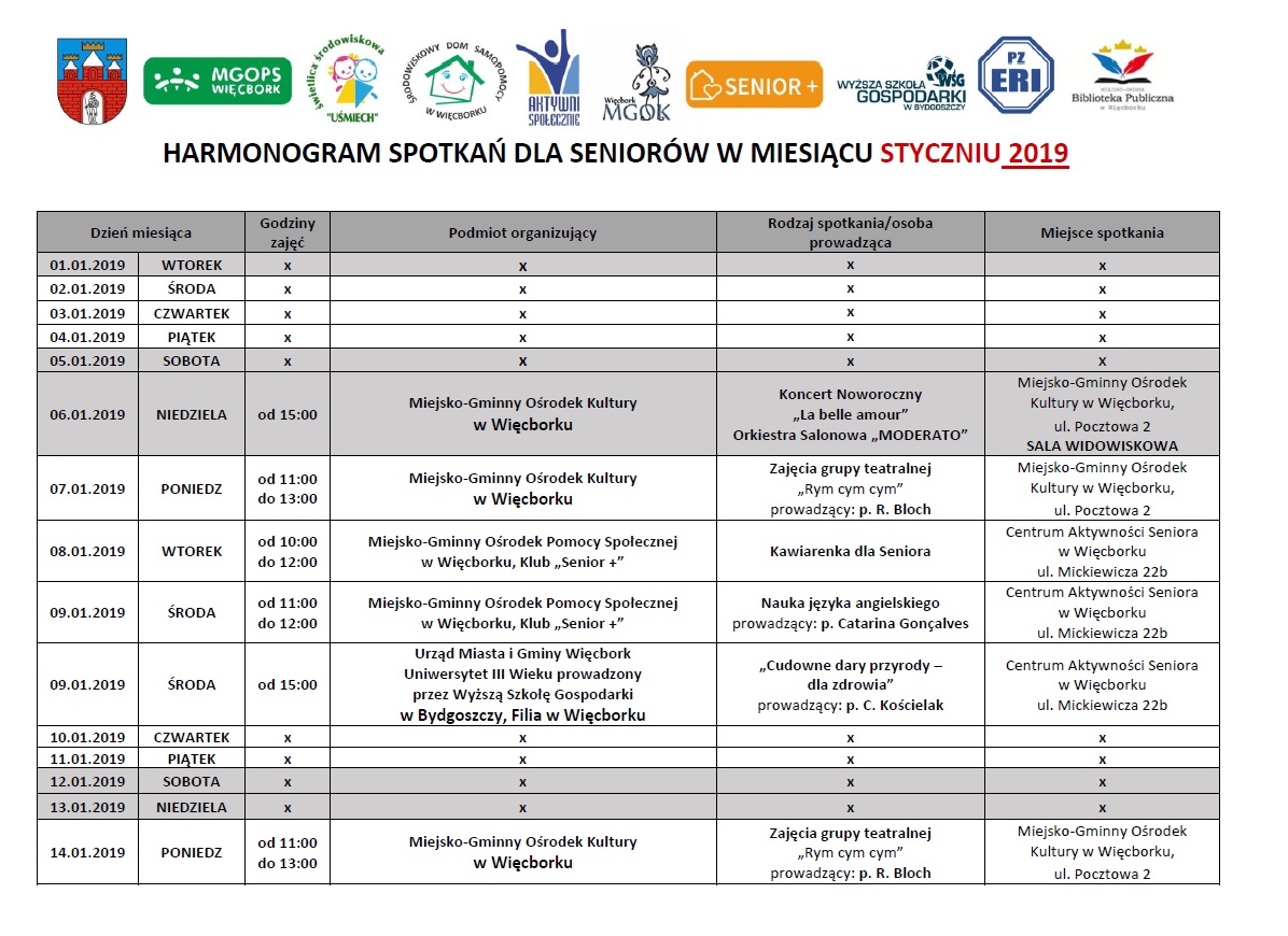 Lokalne jednostki organizacyjne przygotowały dla seniorów z terenu miasta i gminy Więcbork ofertę wsparcia w postaci spotkań o charakterze kulturalnym, edukacyjnym oraz rozrywkowym. Ze wszystkich inicjatyw został stworzony harmonogram spotkań, który zamieszczamy na naszej stronie internetowej (prawa kolumna, pozycja „Harmonogram spotkań seniorów”). Można go również pobrać klikając tutaj.