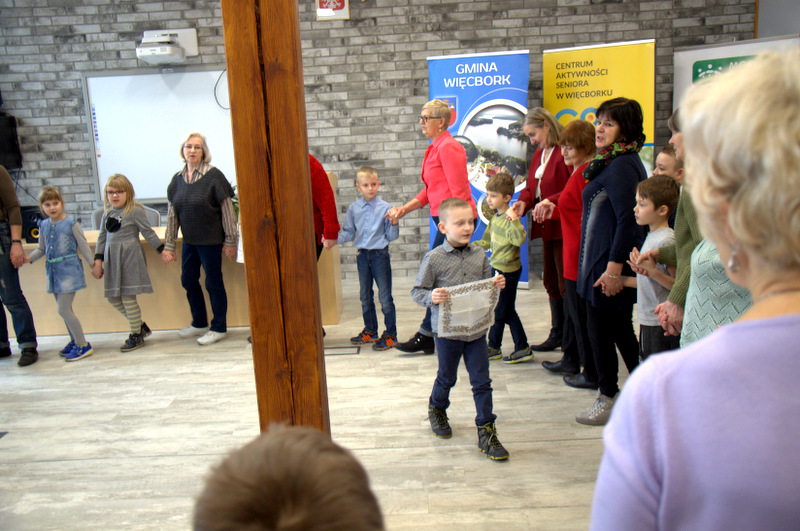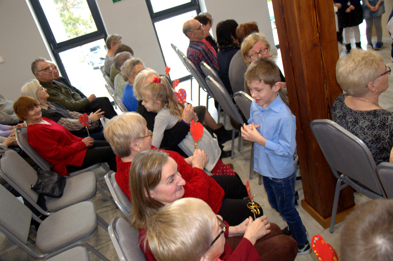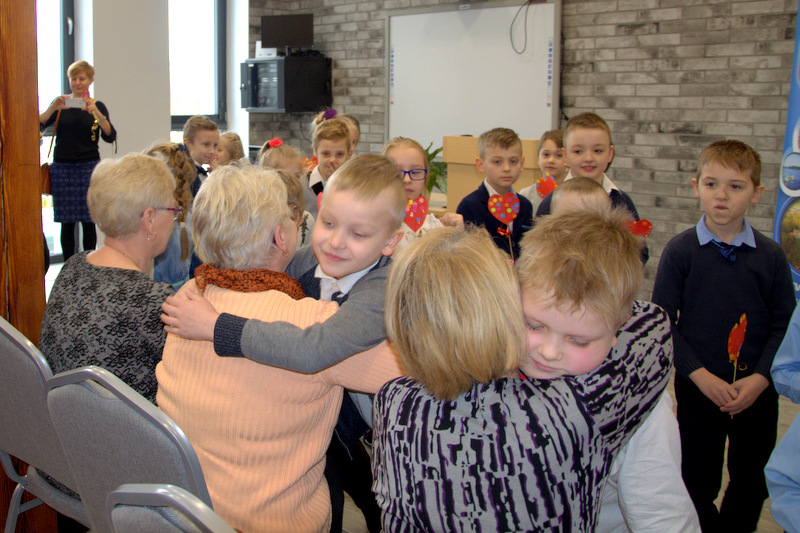 Uczniowie z klasy I A i I B, pod opieką pań Ewy Sobiech i Alicji Kołodziejek przedstawili okolicznościowy montaż słowno-muzyczny. Każdy z seniorów otrzymał z rąk dzieci ręcznie wykonany upominek. Na zakończenie seniorzy wspólnie z dziećmi wzięli udział w popularnej grze “Mam chusteczkę haftowaną”.