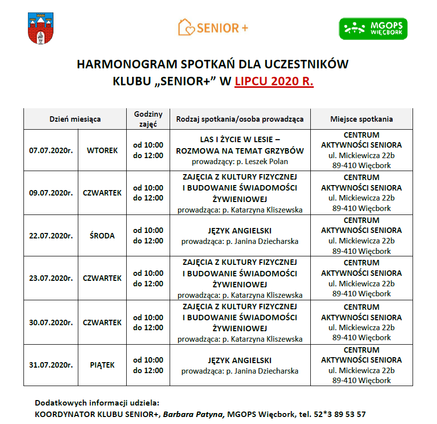 Powyżej zamieszczamy harmonogram spotkań dla uczestników Klubu SENIOR+ w lipcu 2020 roku.