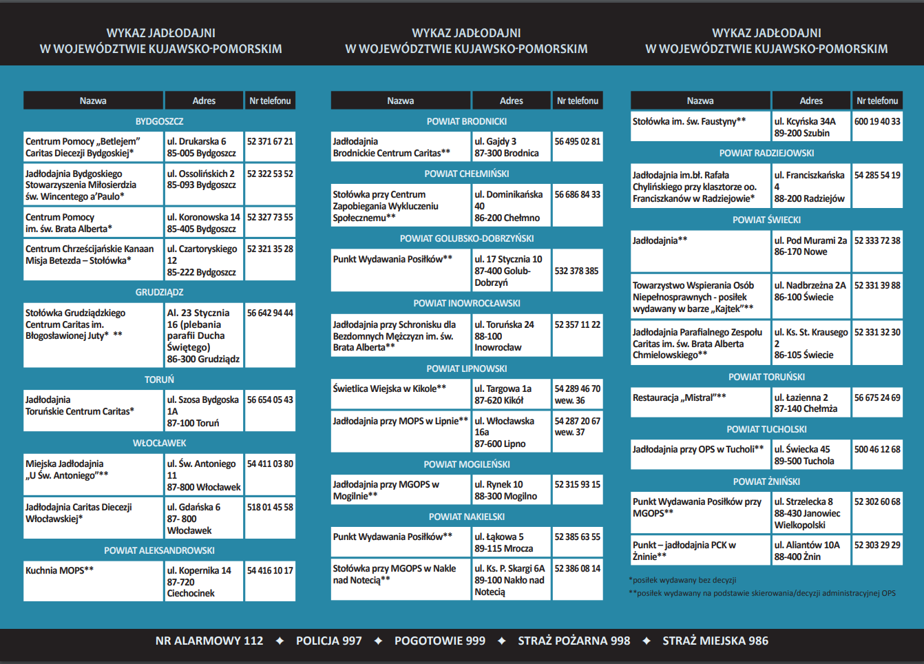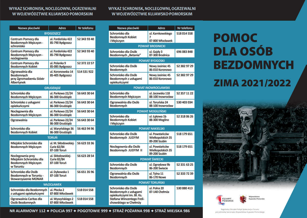 INFORMATOR O MIEJSCACH UDZIELANIA POMOCY OSOBOM BEZDOMNYM NA TERENIE WOJEWÓDZTWA KUJAWSKO-POMORSKIEGO.
