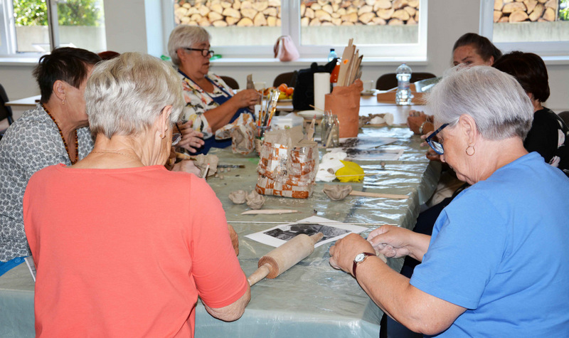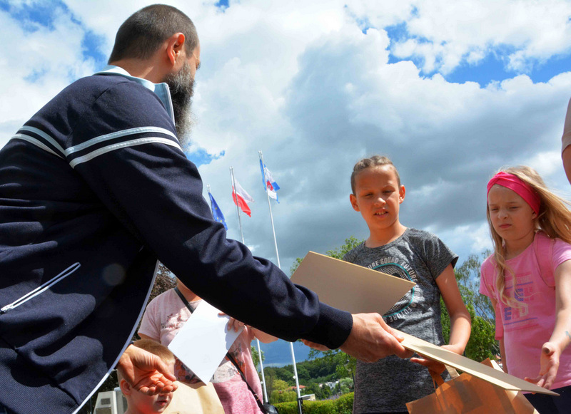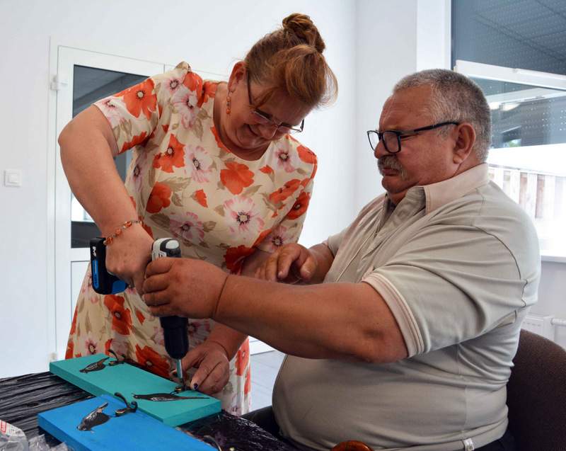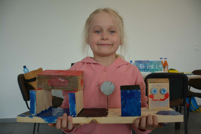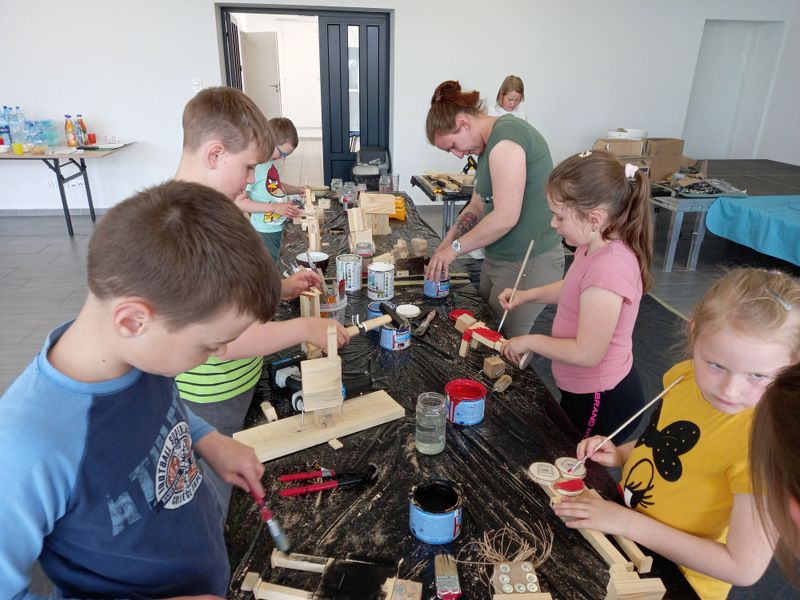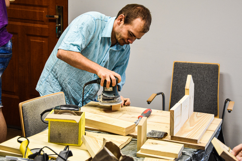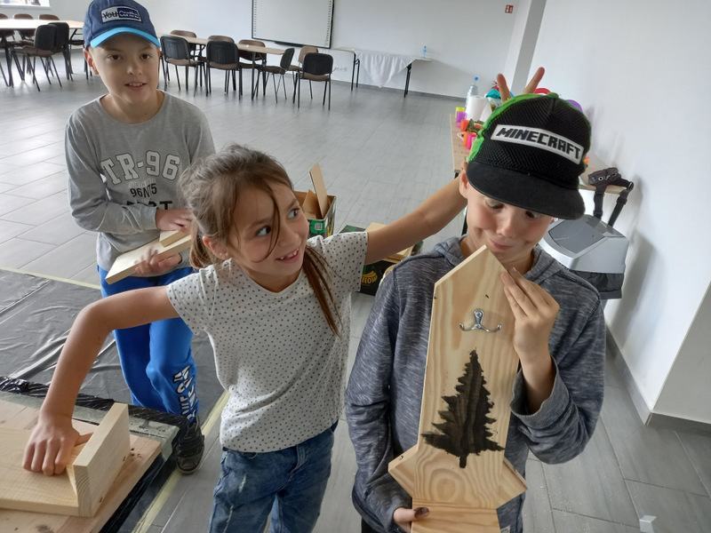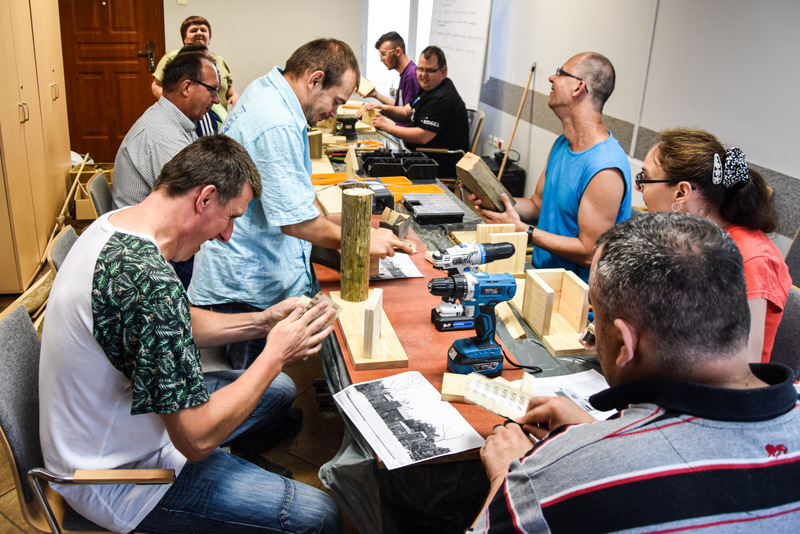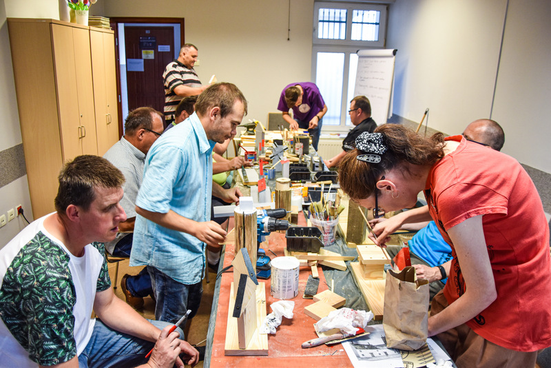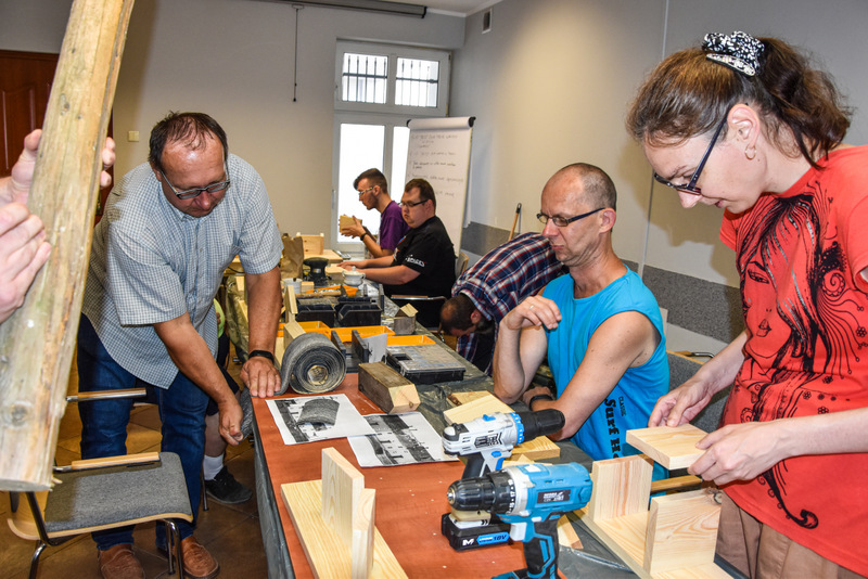 Uczestnicy zdążyli już się zaprzyjaźnić z prowadzącymi: twórczą rękodzielniczką Panią Agatą Urbańską-Krasowską, doświadczonym w pracach technicznych Panem Mariuszem Krasowskim i z aktywnym pszczelarzem Panem Pawłem Piątek.