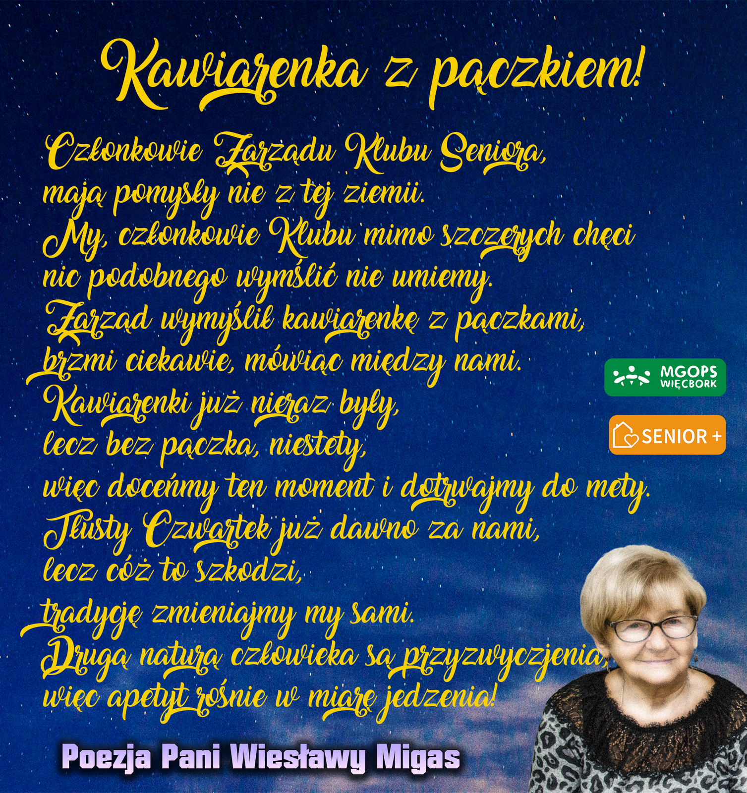 Klub SENIOR+ w Więcborku ma swoją wieszczkę. To Wiesława Migas, osoba niezwykle uważna, z lekkim piórem. Poezję tworzy czasami na zawołanie. Tak jak na przykład wiersz o wczorajszym spotkaniu w Centrum Aktywności Seniora. Poniżej zamieszczamy kilka dzieł naszej poetki (Kliknij “czytaj więcej”).