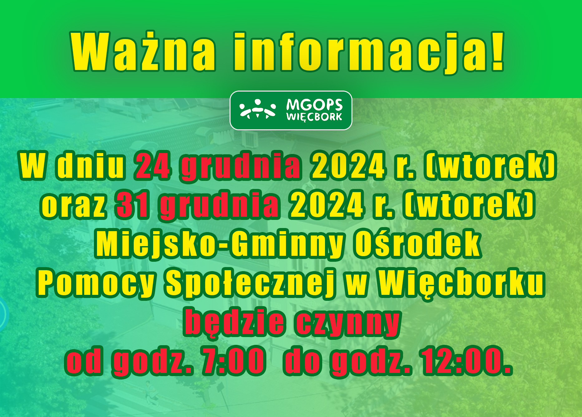 Dyrektor MGOPS w Więcborku informuje, iż zgodnie z Zarządzeniem Burmistrza Więcborka, w dniu 30 kwietnia 2021 (piątek) Miejsko-Gminny Ośrodek Pomocy Społecznej...